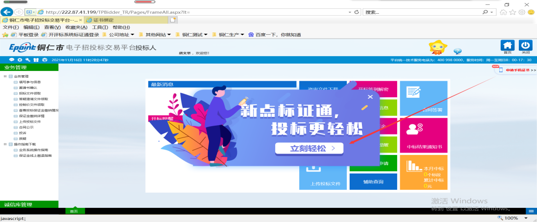 用賬號密碼登錄業(yè)務系統(tǒng)后,點擊右上角的【掃碼綁定證書】后,彈出彈窗,點擊【立刻輕松】;如【圖1】