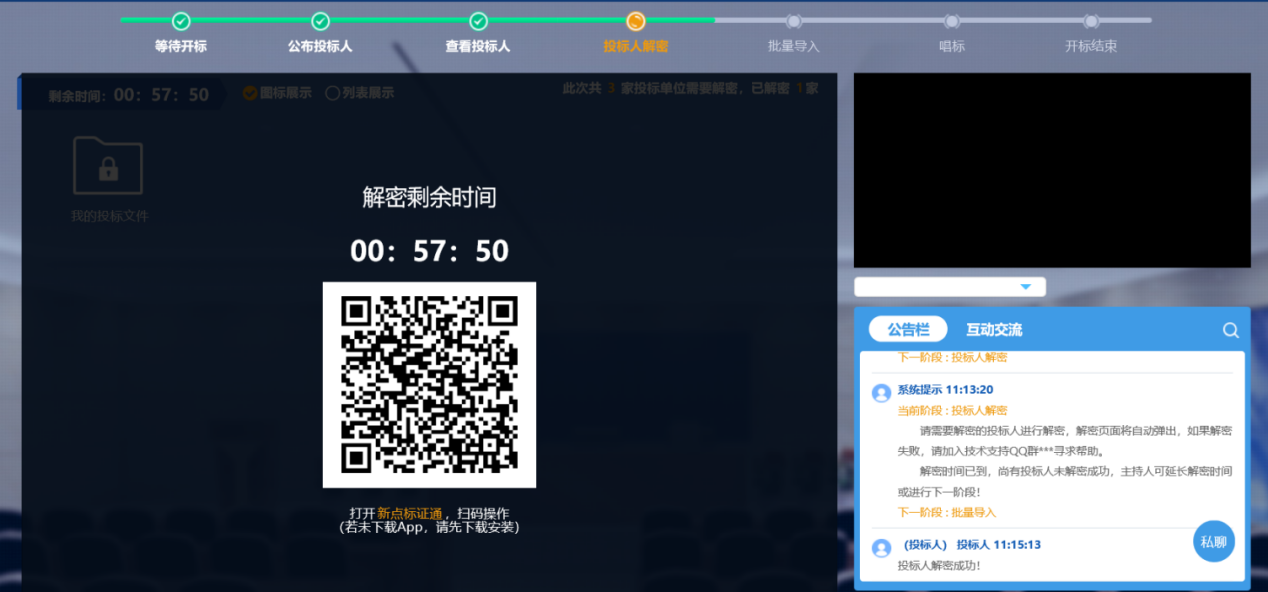 項目開標時,采用新點標證通加密的投標文件,投標人可以在開標大廳或評標系統(tǒng)使用新點標證通APP進行掃碼解密。
