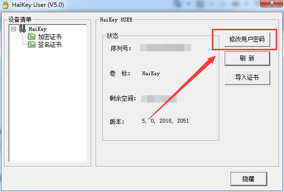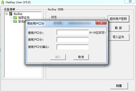 修改方式:在海泰用戶工具中點(diǎn)擊【修改用戶密碼】按鈕,輸入舊口令和新口令后確認(rèn)修改即可。