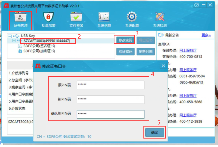 (1)插上需修改密碼的證書Ukey,雙擊“貴州省公共資源交易平臺(tái)數(shù)字證書助手”并確認(rèn)證書信息;