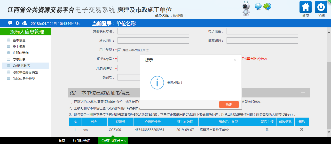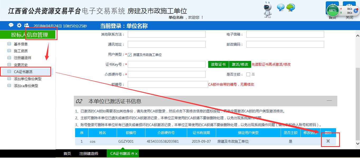 1)使用賬號登錄系統(tǒng)后,點(diǎn)擊“信息管理”菜單下的“CA證書激活”模塊(每個(gè)單位類型下都有該模塊),找到原先主鎖激活記錄,點(diǎn)擊“×”按鈕(此方法適合能使用賬號登錄系統(tǒng)的用戶,若不記得賬號可使用第一種方法);