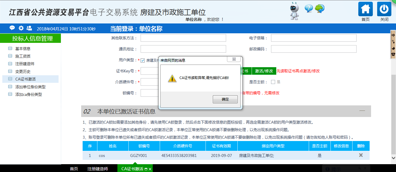 注意:這時(shí)候需要插上新辦的CA主鎖,否則系統(tǒng)會(huì)提示“CA讀取異常,請插好CA鎖”