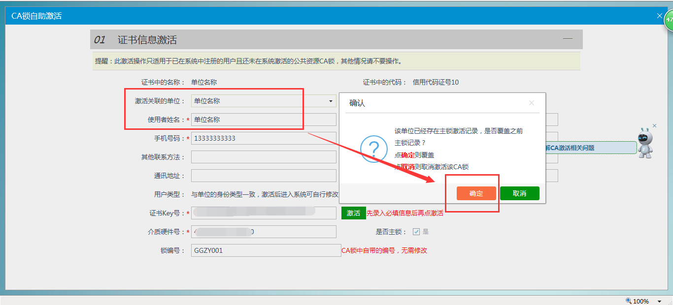 3)點(diǎn)擊“確定”,即可覆蓋原先主鎖激活記錄,激活新辦CA主鎖并正常使用該鎖。