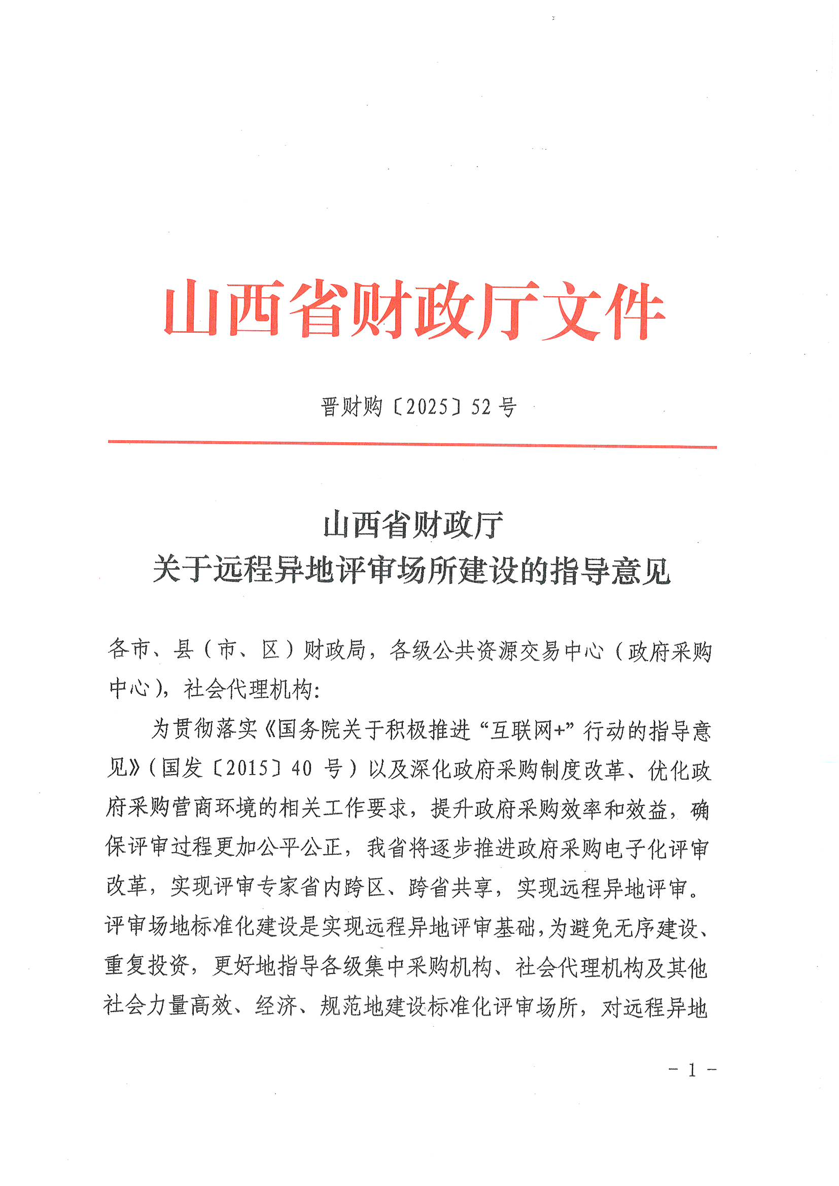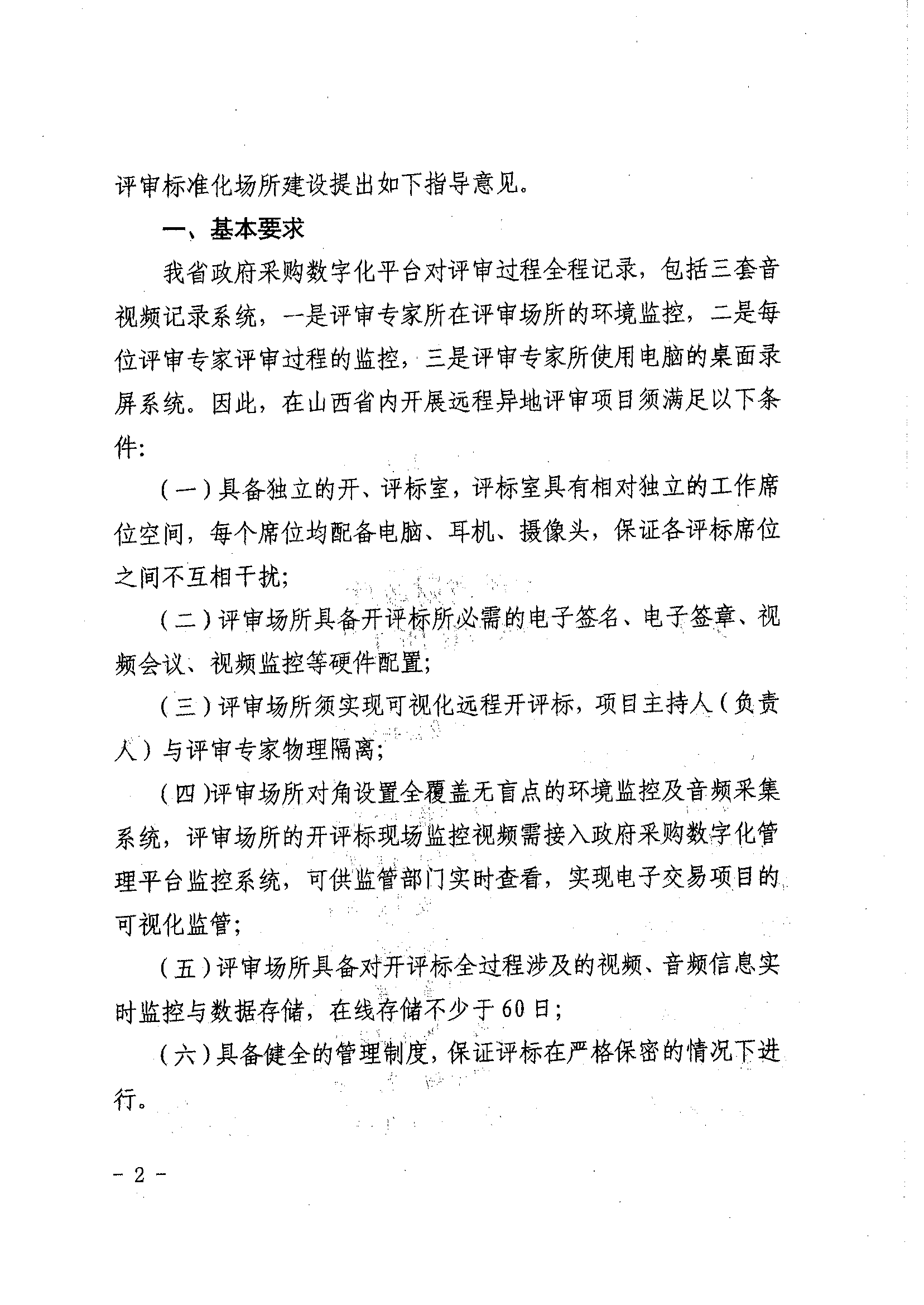 近日,山西省財政廳發(fā)布《關于遠程異地評審場所建設的指導意見》,明確了遠程異地評審場所建設的6項基本要求和18項軟硬件要求。《指導意見》提出遠程異地評審場所的基本要求,包括具備獨立的開、評標室,評標室具有相對獨立的工作席位空間,每個席位均配備電腦、耳機、攝像頭,保證各評標席位之間不互相干擾;評審場所須實現(xiàn)可視化遠程開評標,項目主持人(負責人)與評審專家物理隔離;評審場所對角設置全覆蓋無盲點的環(huán)境監(jiān)控及音頻采集系統(tǒng)等。